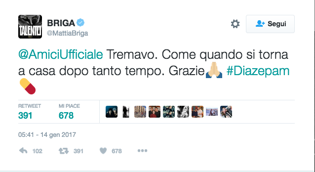 Il ritorno di Mattia Briga è stato atteso e molto gradito e si è concretizzato nel pomeridiano di Amici. Il cantante, protagonista dell’edizione in cui a trionfare furono gli inarrestabili The Kolors di Stash Fiordispino, non ha nascosto una certa emozione nel portare in scena il suo ultimo singolo “Diazepam”.