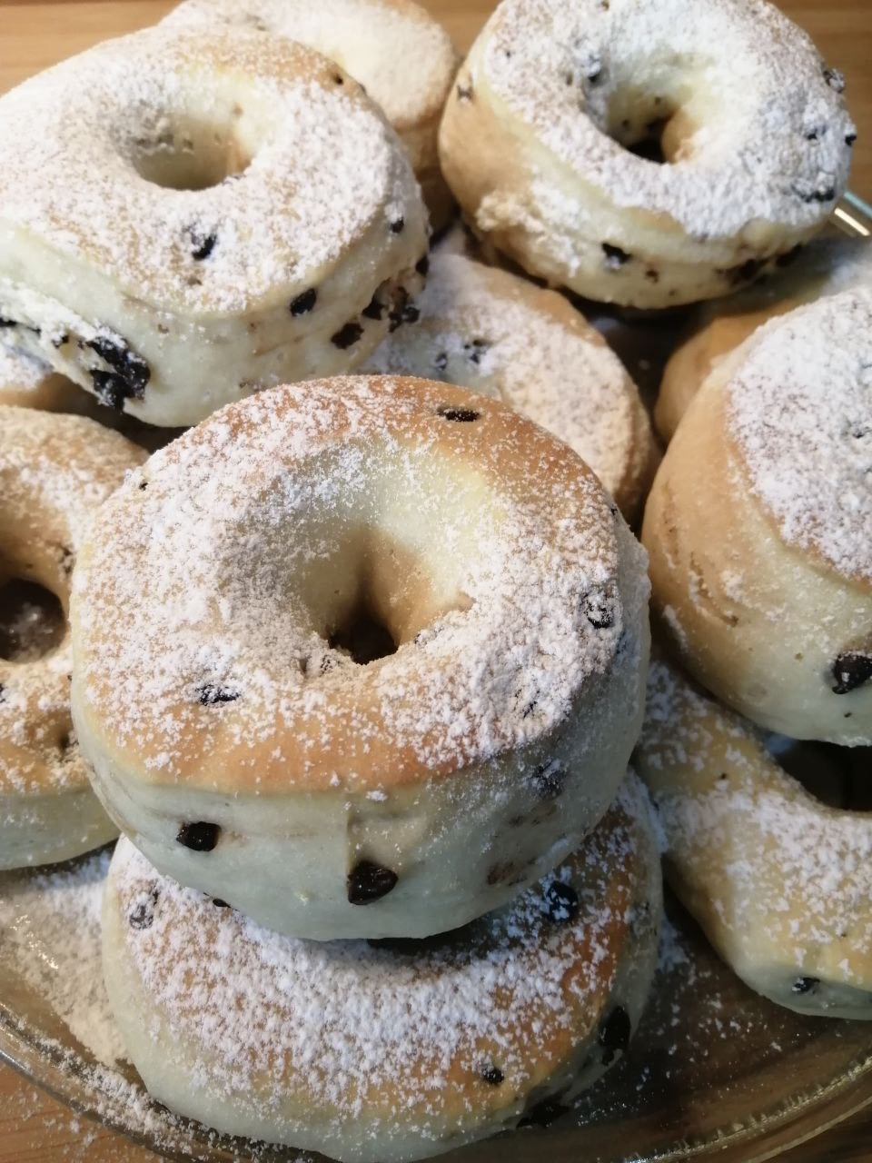Mettere le ciambelle sulla placca del forno, coprire con pellicola e far ri lievitare per almeno 40 minuti.