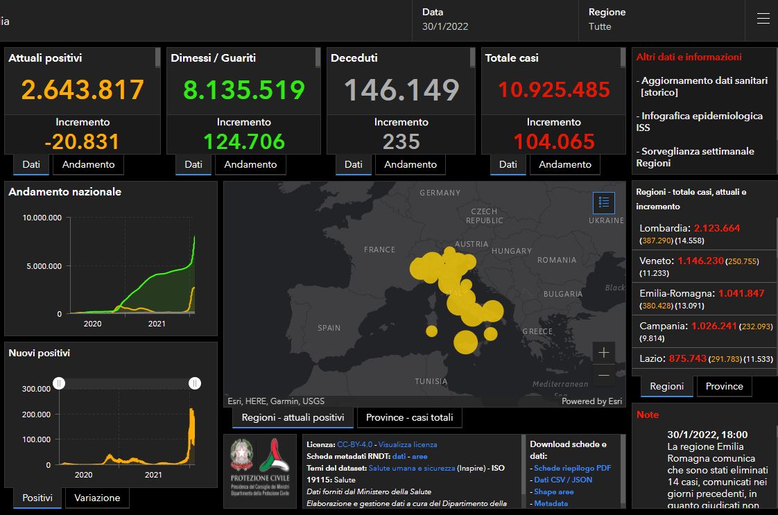 ROMA (ITALPRESS) – Sono 104.065 i nuovi casi di Coronavirus in Italia (ieri 137.147) a fronte di 818.619 tamponi effettuati su un totale di 170.153.413 da inizio emergenza. E’ quanto si legge nel bollettino del Ministero della Salute-Istituto Superiore di Sanità di oggi. Nelle ultime 24 ore sono stati 235 i decessi (ieri 377), che portano il totale di vittime da inizio pandemia a 146.149. Con quelli di oggi diventano 10.925.485 i casi totali di Covid in Italia. Attualmente i positivi sono 2.643.817 (-20.831), 2.622.607 le persone in isolamento domiciliare. I ricoverati in ospedale con sintomi sono 19.617 di cui 1.593 in Terapia intensiva. I dimessi/guariti sono 8.135.519 con un incremento di 124.706 unità nelle ultime 24 ore.La regione con il maggior numero di nuovi casi nelle ultime 24 ore è la Lombardia (14.558), poi l’Emilia-Romagna (13.091), il Lazio (11.533) e il Veneto (11.233).