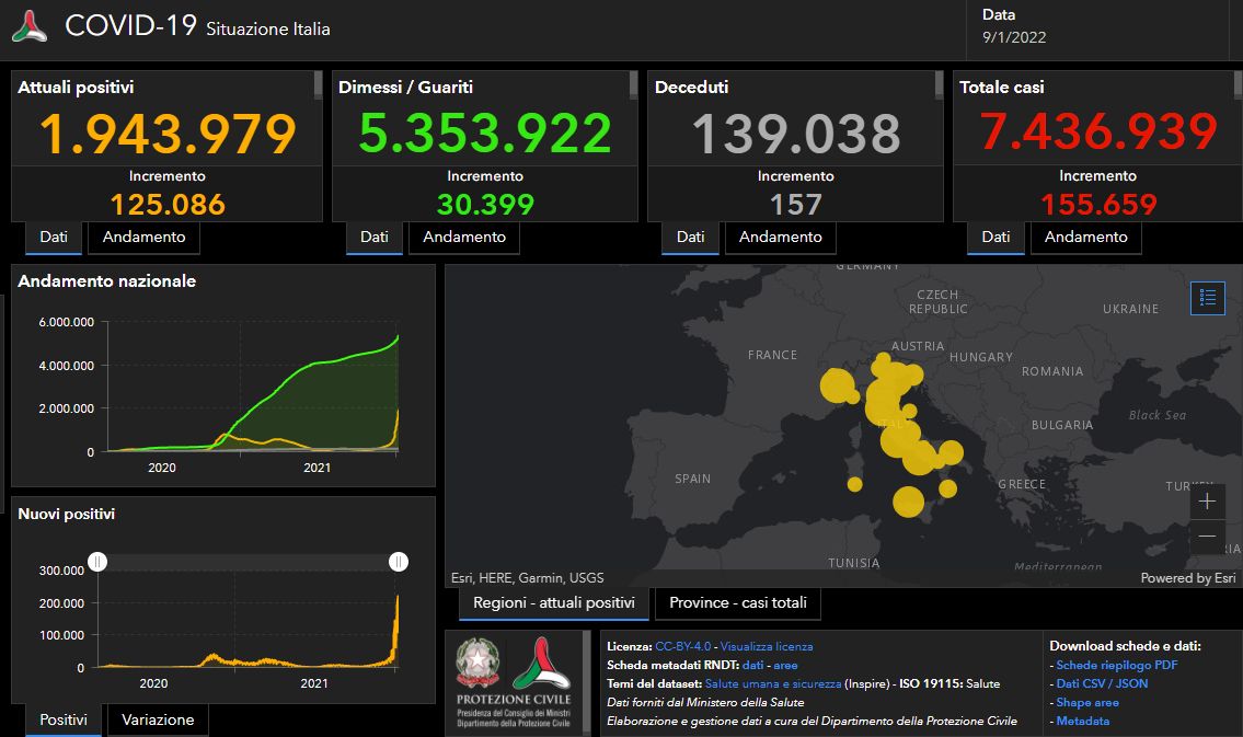 ROMA (ITALPRESS) – Sono 155.659 i nuovi casi di Coronavirus in Italia (ieri 197.552) a fronte di 993.201 tamponi effettuati su un totale di 148.159.131 da inizio emergenza. E’ quanto si legge nel bollettino del Ministero della Salute. Nelle ultime 24 ore sono stati 157 i decessi (ieri 184), che portano il totale di vittime da inizio pandemia a 139.038. Con quelli di oggi diventano 7.436.939 i casi totali di Covid in Italia. Attualmente i positivi sono 1.943.979 (+125.086), 1.926.737 le persone in isolamento domiciliare. I ricoverati in ospedale con sintomi sono 15.647 di cui 1.595 in Terapia intensiva. I dimessi/guariti sono 5.353.922 con un incremento di 30.399 unità nelle ultime 24 ore. La regione con il maggior numero di nuovi casi nelle ultime 24 ore è la Lombardia (36.858), poi l’Emilia-Romagna (17.698) il Veneto (13.973), il Lazio (12.828) e la Sicilia (12.949).