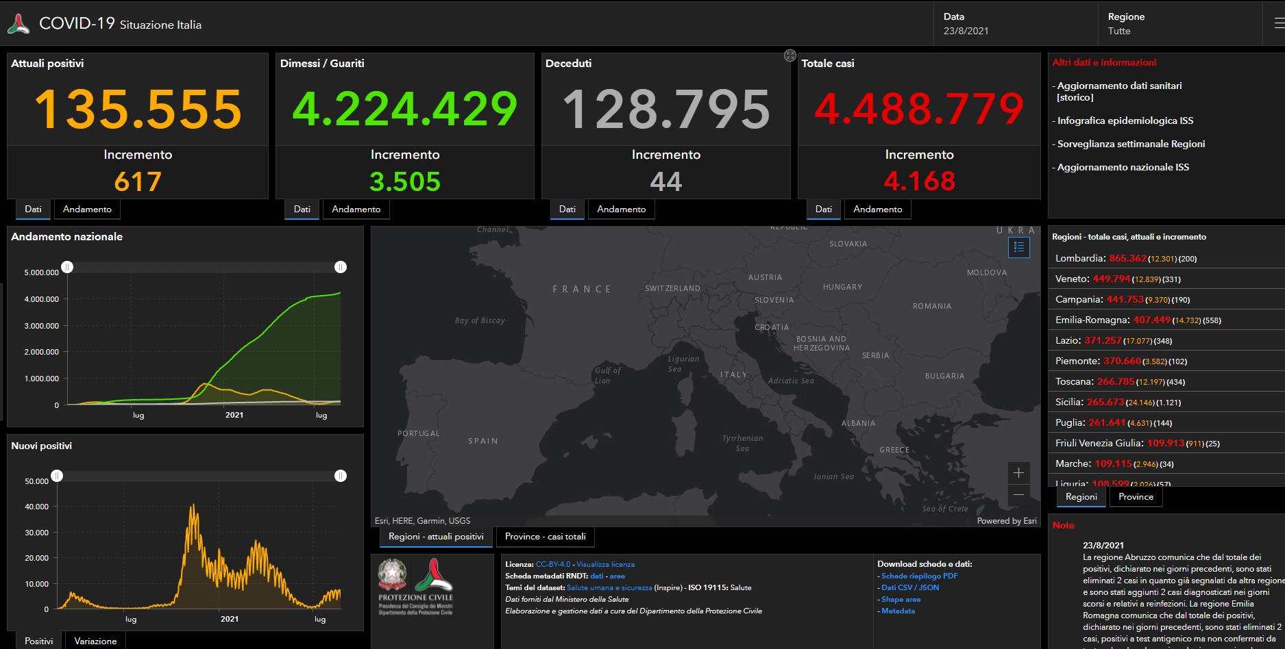ROMA (ITALPRESS) – Sono 4.168 (ieri erano stati 5.923) i nuovi casi Covid registrati nelle ultime 24 ore in Italia con 101.341 tamponi e 44 morti. Lo riferisce il bollettino del ministero della Salute. Il tasso di positività si attesta al 4,1% in aumento dal 3,4% della precedente rilevazione. Sono 485 le terapie intensive in Italia per Covid, 13 in più rispetto a ieri con 45 nuovi ingressi. 3.928 i ricoveri ordionari, 161 in più nelle ultime 24 ore. Gli attualmente positivi sono 135.555 (+617 nelle ultime 24 ore), 4.224.429 i dimessi/guariti da inizio emergenza (+3.505). Le persone in isolamento domiciliare sono 131.142.(ITALPRESS).