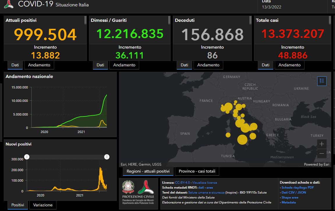 ROMA (ITALPRESS) – Sono 48.886 i nuovi casi di Coronavirus in Italia (ieri 53.825) a fronte di 330.028 tamponi effettuati su un totale di 192.560.616 da inizio emergenza. E’ quanto si legge nel bollettino del Ministero della Salute.Nelle ultime 24 ore sono stati 86 i decessi (ieri 133), che portano il totale di vittime da inizio pandemia a 156.868. Con quelli di oggi diventano 13.373.207 i casi totali di Covid in Italia. Attualmente i positivi sono 999.504 (+13.882), 990.748 le persone in isolamento domiciliare. I ricoverati in ospedale con sintomi sono 8240 di cui 516 in Terapia intensiva. I dimessi/guariti sono 12.216.835 con un incremento di 36.111 unità nelle ultime 24 ore.