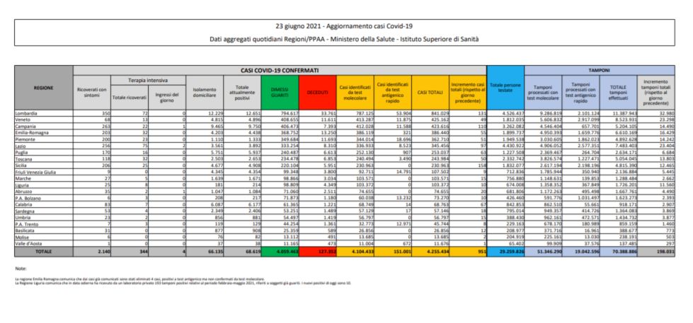 ROMA (ITALPRESS) – Nuova (anche se contenuta) crescita dei nuovi casi di coronavirus che rimangono comunque sempre sotto quota 1000. Per l’esattezza i nuovi positivi sono 951, in rialzo di 116 unità rispetto a ieri a fronte però di un numero superiore di tamponi processati, 198.031 e che determina un tasso di positività allo 0,48%. A riportarlo il Ministero della Salute nel consueto quotidiano bollettino. Quasi stabili i decessi, 30 (-1).I guariti nelle ultime 24 ore sono 5.455, si riducono gli attualmente positivi di 4.345 con un numero complessivo che si attesta su 68.619. Il calo riguarda pure i ricoveri nei reparti ordinari, dove attualmente si trovano in 2.140, 101 degenti in meno rispetto le 24 ore precedenti; il calo si registra pure nelle terapie intensive, dove oggi si trovano 344 pazienti, con un saldo complessivo nel rapporto ingressi/uscite in negativo di 18 ma con 4 nuovi ingressi, il numero più basso dell’anno. In isolamento domiciliare vi sono 66.135 persone. Per quanto riguarda le singole regioni, la regione con il maggior numero di casi si conferma la Sicilia (158), seguita da Lombardia (131), e Campania (110). Al contrario in Molise e Valle d’Aosta si registra rispettivamente 2 e 1 caso.