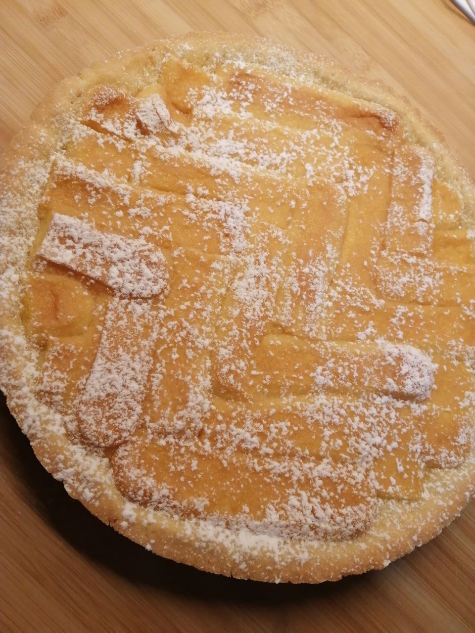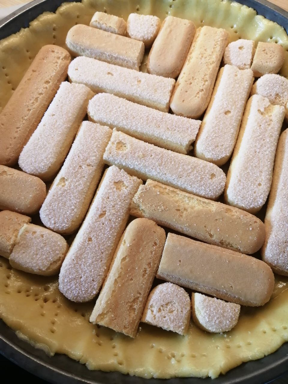 Ora stendete la frolla in una tortiera da 24 cm, bucherellate e mettete i savoiardi a lisca di pesce coprendo bene la superficie. Versare la crema e aspettare quanche minuto che i bistotti assorbano.
