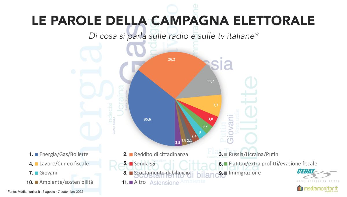 Analizzando i dati relativi alle principali emittenti televisive e radiofoniche, nazionali e locali, Mediamonitor.it conferma il peso della crisi energetica su queste elezioni: negli ultimi trenta giorni, infatti, i temi legati alla campagna elettorale maggiormente citati sono “energia” (1.234 menzioni), “gas” (975) e “bollette” (666) che, tutti e tre insieme, assorbono quasi il 36% del dibattito elettorale. Un tema molto caldo è quello del “Reddito di Cittadinanza” che alcuni partiti vogliono abolire o cambiare: con 2116 citazioni rappresenta oltre un quarto delle discussioni (26,2%) sui media televisivi e radiofonici. Il “lavoro” è in quinta posizione (605).