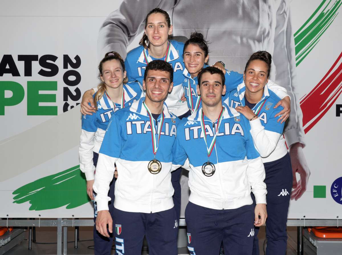 PLOVDIV (BULGARIA) (ITALPRESS) – La scherma italiana scrive la storia nella prima giornata dei Campionati Europei Assoluti Individuali di Plovdiv 2023: sei medaglie in due gare, di cui due d’oro e un podio tutto azzurro nel fioretto femminile. Non era mai successo, neppure negli anni magici del Dream Team. E poi la doppietta della spada maschile. Un venerdì indimenticabile sulle pedane bulgare che consacra campioni d’Europa la fiorettista Martina Batini e lo spadista Davide Di Veroli, mentre sono d’argento Martina Favaretto nel fioretto e Federico Vismara nella spada, ma ancora tra le fiorettiste, dove le quattro bandiere sul podio sono tutte Tricolore, vincono il bronzo Francesca Palumbo e Alice Volpi. Negli annali pure l’oro di Di Veroli nella spada maschile individuale che mancava all’Italia dell’Europeo di Foggia 1981 (lo vinse Angelo Mazzoni). “Una giornata emozionante, epica. Le ragazze del fioretto e i ragazzi della spada ci hanno regalato una gioia che salta a piè pari dalla cronaca alla storia. E mi piace sottolineare che questo trionfo italiano sia arrivato in due gare dall’altissimo livello tecnico, con in pedana il meglio del Vecchio Continente e i leader del ranking mondiale. Segno che l’Italia non ha soltanto primeggiato in Europa, ma ha dimostrato di essere una potenza a livello globale”, le parole del presidente della Federazione Italiana Scherma, Paolo Azzi. Record assoluto per il fioretto femminile: il ct Stefano Cerioni aveva quattro atlete in gara e tutte si sono prese un posto sul podio. Il titolo di campionessa europea alla fine è andato a Martina Batini, che ha vinto il derby contro Martina Favaretto, costretta al ritiro sul 9-6 per un problema fisico tra lacrime, abbracci ed emozioni fortissime. Ma già in semifinale l’Europeo di Plovdiv aveva assunto le sembianze di una gara “Open nazionale”. S’era delineato così, questo scenario storico, quando nei quarti di finale, una dopo l’altra, le azzurre hanno dominato le rispettive avversarie: Martina Batini ha superato la spagnola Castro (15-4), Francesca Palumbo si è imposta sulla polacca Lyczbinska (15-8), Alice Volpi, dopo aver lottato e vinto all’ultima stoccata negli ottavi sulla britannica Stutchbury (15-14), ha eliminato d’autorità la francese Patru, e infine Martina Favaretto, che nel turno precedente aveva estromesso una campionessa come la francese Thibus (15-11), ha completando il poker azzurro battendo la polacca Walczyk Klimaszyk (15-8). Quattro su quattro per l’Italia, tutto il podio tricolore. A quel punto, nelle semifinali, i derby hanno visto gioire le due Martina: Batini ha superato Francesca Palumbo per 15-12, mentre Favaretto ha avuto ragione di Alice Volpi con il punteggio di 15-9. In finale il successo di Martina Batini, oro al collo, con Martina Favaretto d’argento, entrambe tra gli applausi. Suona l’Inno di Mameli anche per la super doppietta azzurra nella spada maschile. Spettacolare la gara di Davide Di Veroli e Federico Vismara, che in finale si sono ritrovati in un fantastico derby italiano: l’ha vinto Di Veroli per 15-14, mettendo il punto esclamativo su una giornata speciale. Il neo campione d’Europa, nella stessa città, Plovdiv, che poche settimane fa aveva incoronato il fratello minore e fiorettista Damiano campione del mondo Under 20, ha conquistato la certezza della medaglia battendo per 15-8 lo svedese Svensson, senza accontentarsi, e superando poi in semifinale il tedesco Brinkmann con il punteggio di 15-12. Parallelamente Federico Vismara, ipotecato il podio grazie al successo nei quarti sull’olandese Van Nunen per 15-9, ha fatto sua anche la semifinale imponendosi sul polacco Antiewicz 15-7. Nella sfida azzurra, il 15-14 per Di Veroli, con Vismara d’argento, altra pagina di storia per la scherma italiana. Sempre nella spada, out nel turno da 32 Valerio Cuomo mentre si è fermato dopo la fase a gironi Gabriele Cimini.Domani l’Europeo di Plovdiv vedrà di scena le gare di spada femminile e sciabola maschile. Per l’Italia in pedana le spadiste Rossella Fiamingo, Federica Isola, Mara Navarria e Alberta Santuccio, mentre tra gli sciabolatori gli azzurri impegnati saranno Luca Curatoli, Michele Gallo, Matteo Neri e Luigi Samele.
