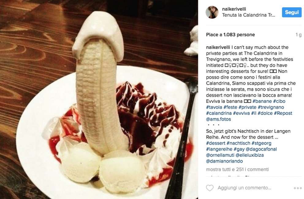 La figlia di Ornella Muti torna a far parlare di sé. Naike Rivelli, ormai famosa sulla rete per le sue foto osé su Instagram, ha pubblicato un dessert a forma di pene, con la didascalia: “Non posso dire come sono i festini alla Calandrina, Siamo scappati via prima che iniziasse la serata, ma sono sicura che i dessert non lasciavano la bocca amara!”