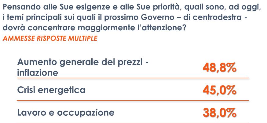 ROMA (ITALPRESS) – L’ultima nota mensile dell’ISTAT relativa all’andamento economico del nostro Paese ha confermato un’ulteriore accelerazione dell’inflazione nel corso del mese di settembre e, secondo l’OCSE, il perdurare della crisi energetica potrebbe causare una decelerazione dell’economia mondiale. Temi che la popolazione italiana percepisce e vive quotidianamente e che, ad oggi, rappresentano una priorità per la maggioranza degli italiani. Al prossimo governo, quindi, si chiede di intervenire tempestivamente sull’aumento generale dei prezzi (48,8%), sulla crisi energetica e l’aumento dei prezzi delle utenze (45%), senza trascurare il lavoro e l’occupazione, ancor di più nelle aree meridionali (38%).Una richiesta di intervento che arriva in modo unanime e trasversale dal nord al sud del Paese. Il problema in questo contesto è, però, una mancanza di fiducia sulla possibilità di ottenere risultati significativi in questo ambito. Quasi la metà della popolazione (il 48,6%), infatti, ritiene poco probabile che il prossimo governo riuscirà ad intervenire in modo positivo. Una diffidenza ancora più alta nella fascia di popolazione più adulta, mentre tra i giovani si registra una maggiore indecisione sul tema.