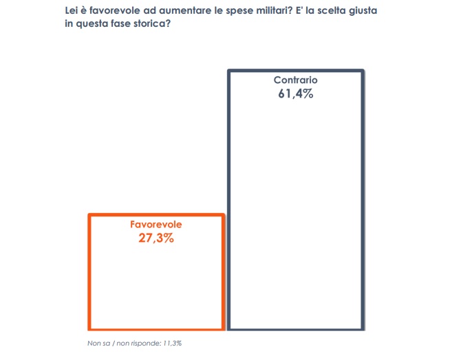 ROMA (ITALPRESS) – Da giorni, soprattutto a causa della guerra tra Russia e Ucraina, in Italia si discute dell’aumento della spesa militare fino al 2% del PIL, come concordato con la NATO e come già fatto da altri Paesi della coalizione. Quasi 2 italiani su 3 (il 61,4%) però si dichiarano contrari a questa decisione, secondo quanto emerge da un sondaggio di Euromedia Research.Aumentare le spese militari, per il 37,6% degli intervistati, vuol dire distogliere investimenti da altri settori che ad oggi risultano essere prioritari per l’Italia. Inoltre, con un aumento di spesa si investirà maggiormente in attrezzature militari. L’opinione degli italiani cambia, invece, nel momento in cui la spesa militare venga destinata anche – e soprattutto – agli investimenti in tecnologie, ricerche e materie scientifico-tecnologiche e non, quindi, alle attrezzature. In un contesto di questo tipo, la quota di contrari all’aumento di spesa scende al 47,3%, mentre i favorevoli passano dal 27,3% al 40%. Una scelta che, tra i grandi partiti, viene apprezzata ancor di più tra gli elettori di Forza Italia e del Partito Democratico.