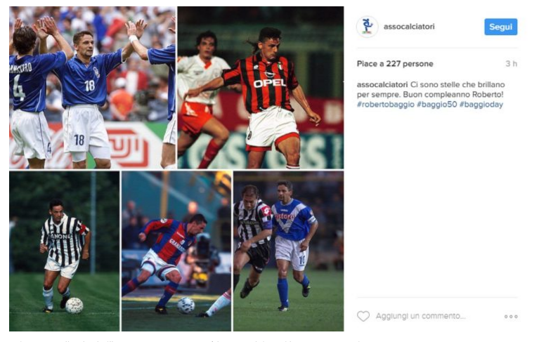 Roberto Baggio è rimasto ed è sempre nel cuore di tutti i tifosi, in particolare di quelli delle squadre nelle quali ha militato. Nel giorno dei suoi 50 anni sono tanti, attraverso i social, gli auguri indirizzati al Divin Codino di Caldogno. A partire proprio dalle sue ex squadra. «Auguroni Roberto BaggioOfficial! Tra i primi accaunt social a pubblicare gli auguri a Baggioè stato infatti quello della Nazionale azzurra. Coverciano ha omaggiato al campione con due post in cui si legge ” Per realizzare i miei sogni ho agito sempre spinto solo dalla passione. La passione muove ogni cosa, è una forza davvero straordinaria”.