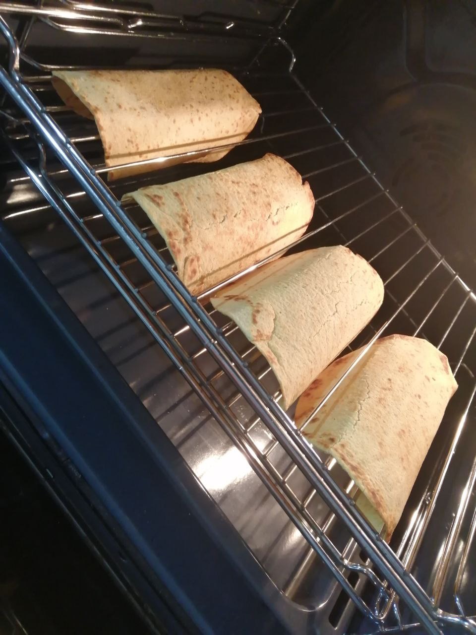 100 gr di farina 00 100 grammi di farina di mais Sale qb 1 cucchiaio di olio 1 Cucchiaino di bicarbonato Acqua quanto basta per ottenere un panetto omogeneo e morbido. Ne serve davvero poca, circa 80 ml… Quindi aggiungetela poco alla volta mentre impastate. Lasciate riposare per una mezz’oretta. Dividete il panetto in 6 pezzi uguali e stendeteli abbastanza fini. Scaldate una padella e cuocete i tacos per 2 minuti per lato. Io li ho messi poi a raffreddare, x dargli la forma classica, sulla griglia del forno. Lo stesso impasto fatto piccolo e poi fritto serve per fare i nachos