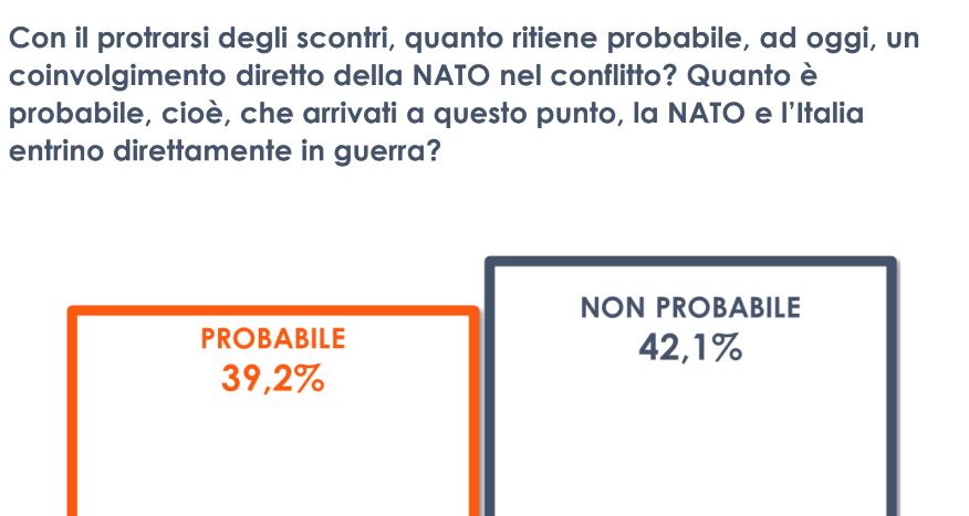 ROMA (ITALPRESS) – Un anno fa la Russia di Putin ha annunciato un’operazione militare speciale nel Donbass e dato inizio, di fatto, all’invasione dell’Ucraina e al conflitto russo-ucraino. Una guerra che fa ancora paura agli italiani, oggi come e più di ieri. Ripensando al febbraio del 2022 e ai primi giorni di guerra, quasi 2 italiani su 3 (il 61,7%) non immaginavano un conflitto così lungo, ma una “guerra lampo” che si sarebbe risolta in breve tempo. Solo un terzo della popolazione, dichiara oggi, che già 12 mesi fa immaginava quest’evolversi e questo protrarsi degli scontri. Arrivati a questo punto – e dopo gli avvenimenti degli ultimi giorni – il rischio di un coinvolgimento diretto e dell’ingresso in guerra della Nato e dell’Italia divide i cittadini tra chi lo ritiene altamente probabile (39,2%) e chi, in leggera prevalenza, lo considera più remoto (42,1%). In conclusione, gli italiani, da un anno a questa parte, stanno subendo i risvolti e le conseguenze di questo conflitto che si sta prolungando oltre il previsto e che riguardano soprattutto l’aspetto economico. Una guerra, dunque, che preoccupa e spaventa la quasi totalità degli italiani. Oggi come un anno fa.