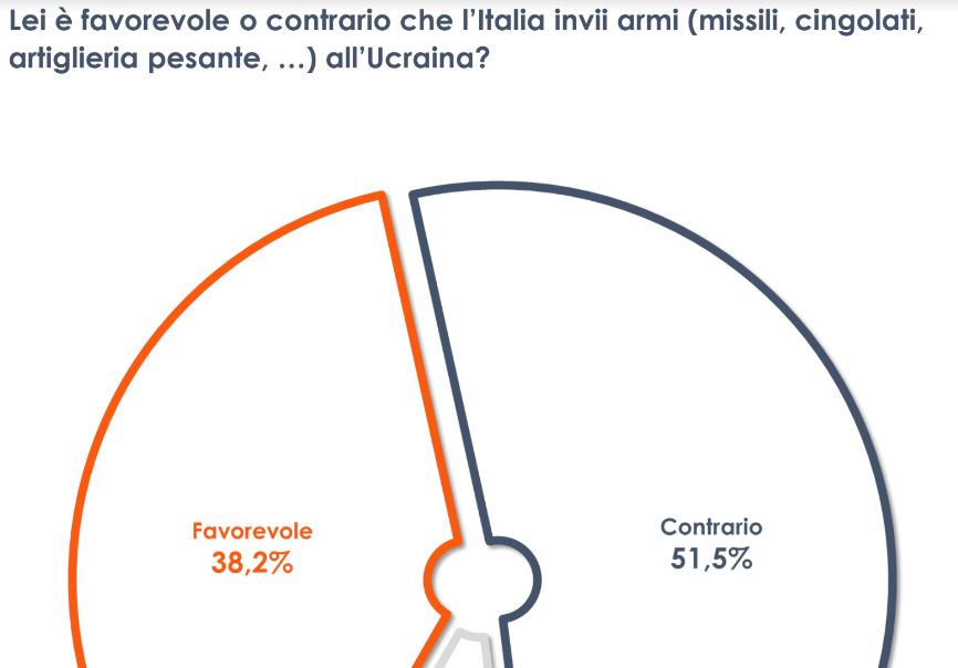 ROMA (ITALPRESS) – Dopo oltre tre mesi di conflitto e scontri tra Russia e Ucraina, crescono sempre di più gli italiani (sono il 61,3%) che, in questa guerra, sostengono le ragioni del popolo ucraino e sono contrari, dunque, all’attacco da parte della Russia. E’ importante sottolineare, però, come 1 italiano su 5, il 20,9%, in questo contesto, ancora non riesce a esprimere un’opinione chiara e netta sull’argomento. Nonostante sia forte il sostegno alle ragioni ucraine, la maggioranza degli italiani (51,5%) continua ad essere contraria all’invio di nuove armi, proprio per evitare l’eccessivo prolungare della guerra e il rischio di un coinvolgimento diretto da parte dell’Italia. Una contrarietà sostenuta fortemente e che, in oltre il 70% di coloro che si dichiarano contro le armi, viene confermata e ribadita anche se questo dovesse significare la sconfitta del popolo ucraino e l’avanzata dell’invasione russa.Una convinzione che si registra ancora più forte tra gli elettori di Fratelli d’Italia, dove quasi la totalità di coloro che sono contrari all’invio di armi, conferma la propria posizione (88,1%).