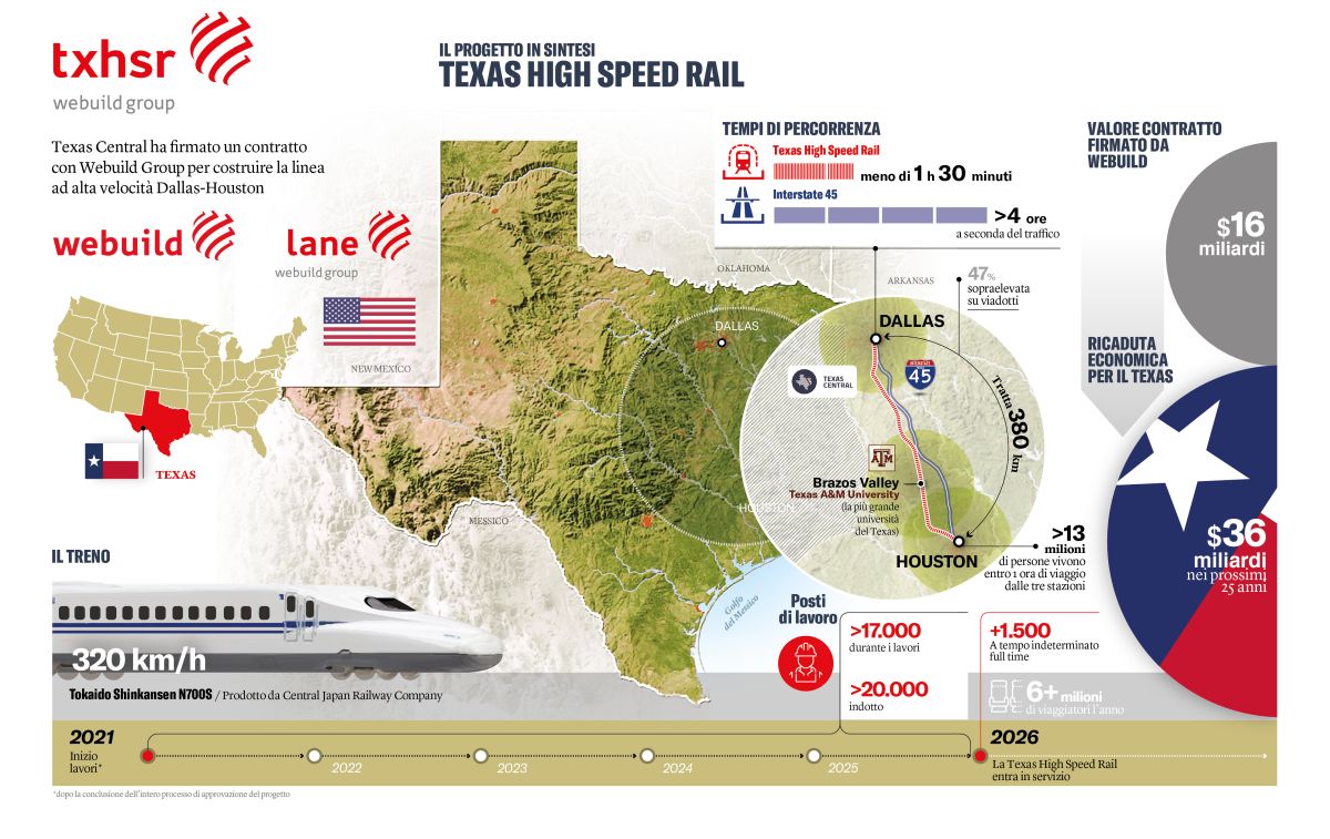 Il contratto definitivo, firmato con Texas Central prevede in capo al Gruppo Webuild la realizzazione dei lavori di ingegneria civile, con la progettazione e la realizzazione del tracciato di 379 chilometri (236 miglia), del sistema dei binari, dei viadotti, degli edifici e dei servizi per la manutenzione, per il deposito dei treni e per lo stoccaggio dei materiali. Gran parte del tracciato è costituito da viadotti sopraelevati, e potrà beneficiare dell’esperienza del Gruppo nella realizzazione di ponti, per ridurre il più possibile gli impatti per i proprietari terrieri e i residenti delle cittadine attraversate dalla linea.